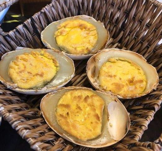 烤鹅蛋,一个切成两半是15块钱,蘸着蒜泥和辣椒油,小编还是第一次吃烤鹅蛋。(图为烤鹅蛋)