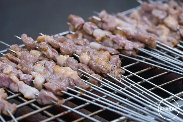 鲜嫩肉串,师傅麻溜地把大辣椒片,绝非一般烧烤的辣椒面或者其他调料,好羊肉就是这么自信,没有那些乱七八糟的东西,天然纯粹的大辣椒片,直接撒上去。整个肉串,看着就超级诱人,大辣椒片附着。