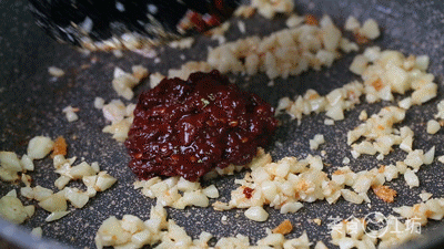 );锅中留底油,加入豆瓣酱和蒜末爆炒出香味;