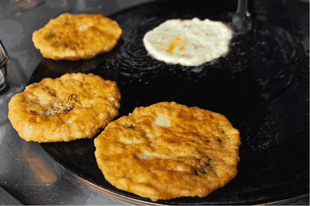 洋芋裹着米浆里,下锅去炸至金黄就成了油糕,外面再包上烤好的饵块,刷上芝麻酱、花生酱等各种酱。