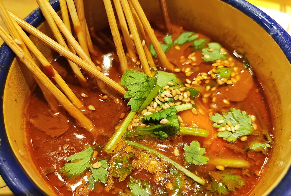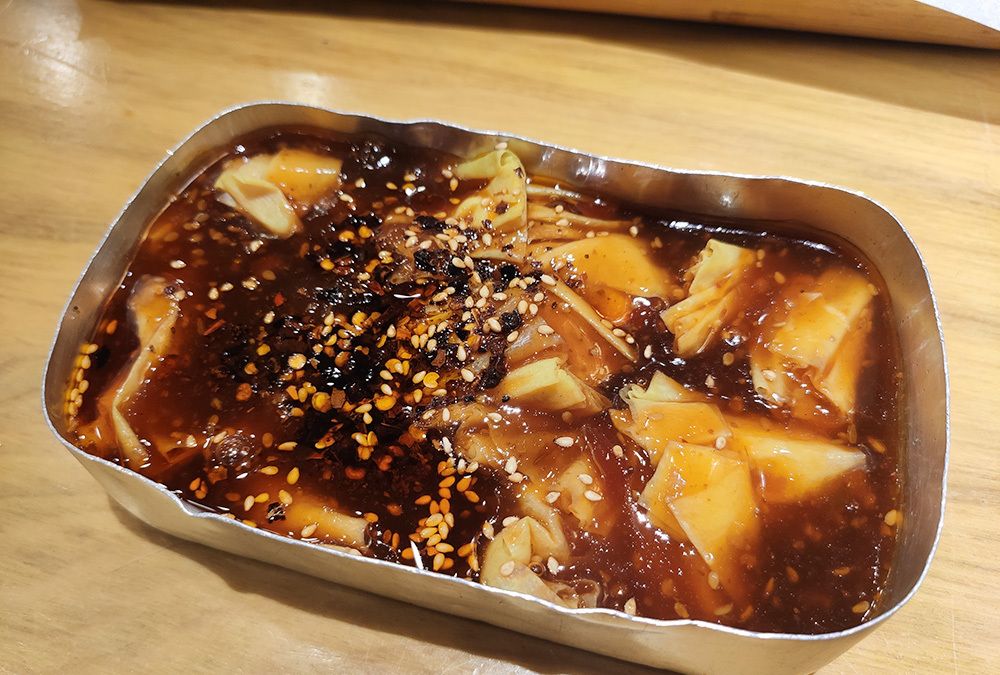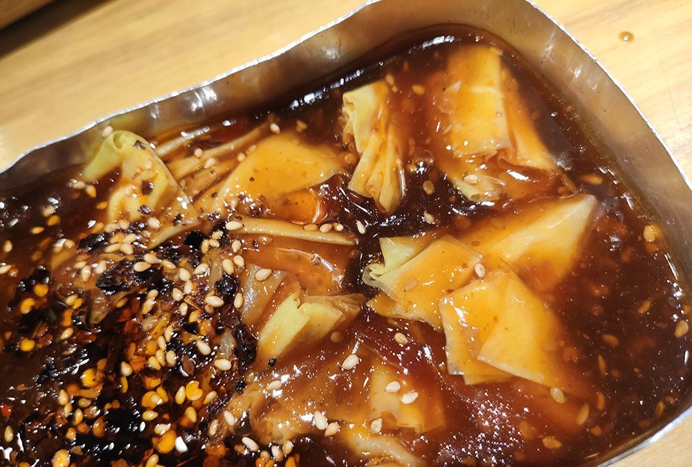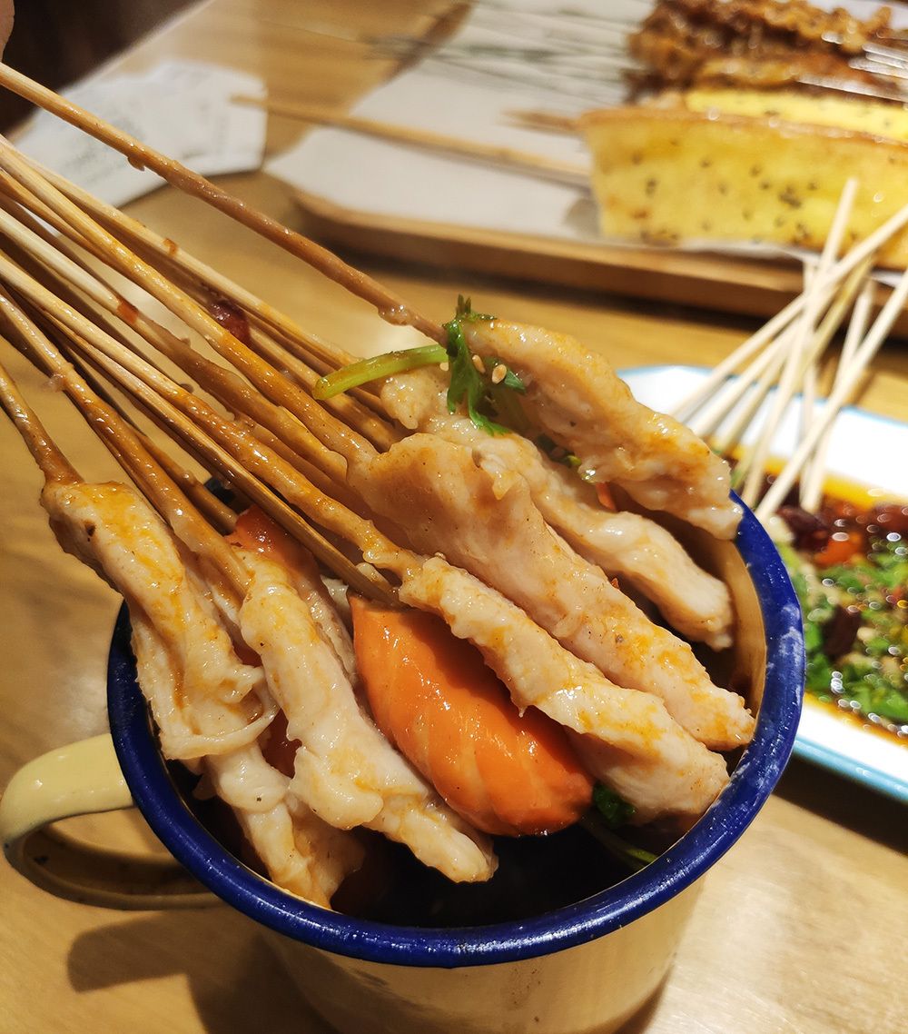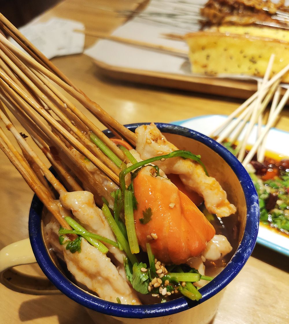 红油小串差不多就是麻辣涮串,我为啥把它列为特色呢?因为它的汤汁里也加了麻酱,所以鸡肉串和龙虾蛋吃起来格外的香,这一茶缸基本都让我包圆了。