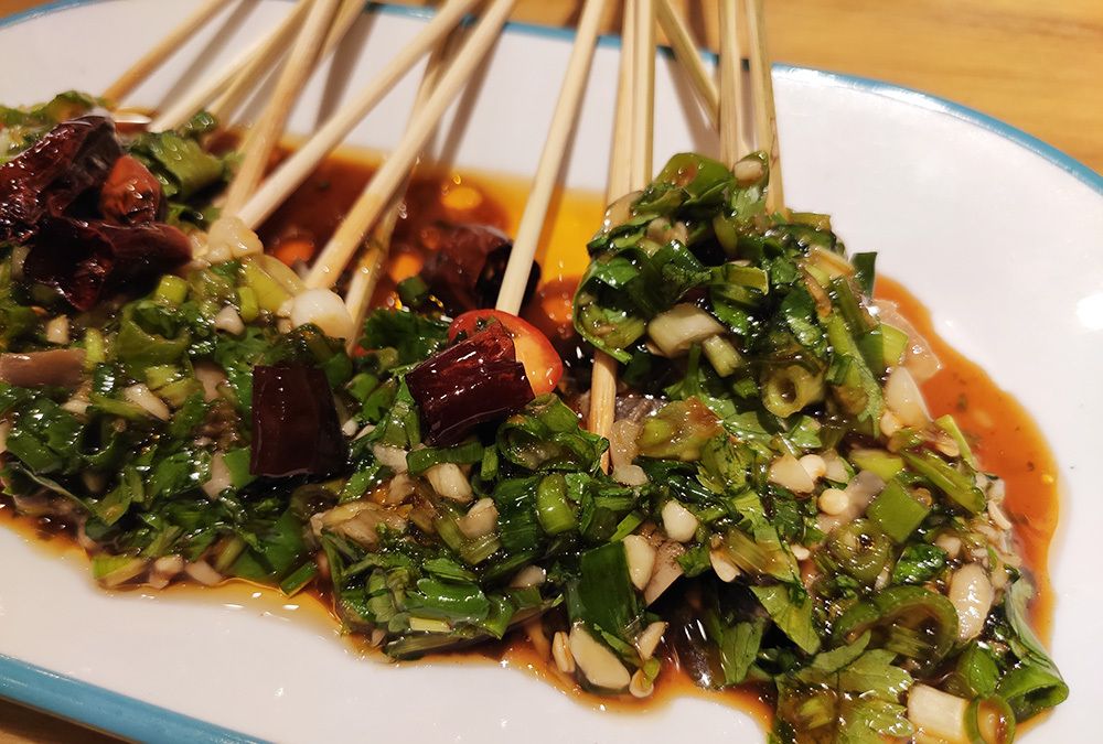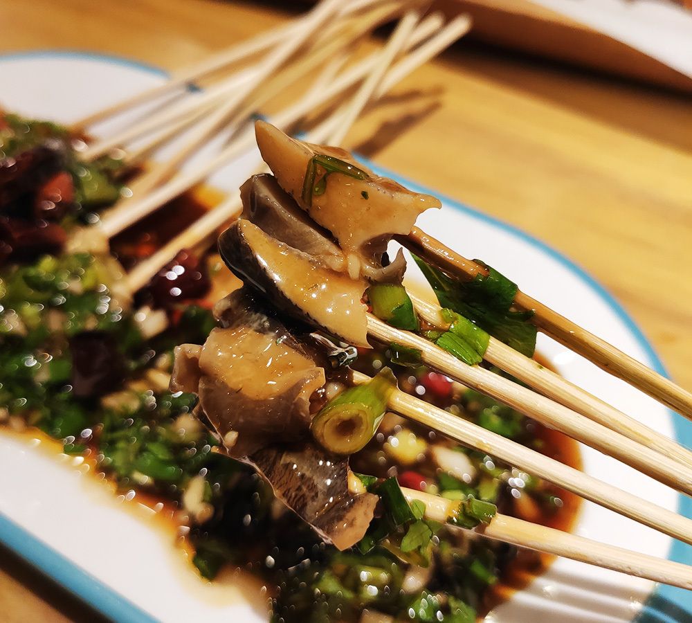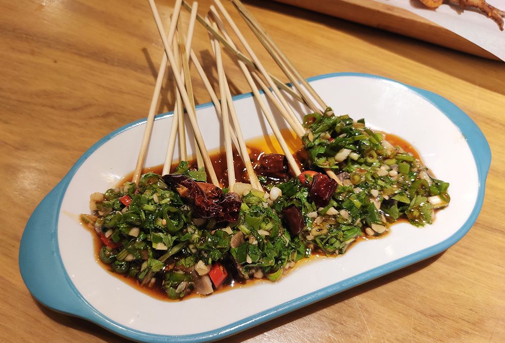 被葱花酱汁盖得满满的凉串螺头,每一块螺肉都特别鲜美,肉完全不老,没有一点腥味儿,不会发苦,颠覆了我对海螺的印象,获得我俩一致好评!