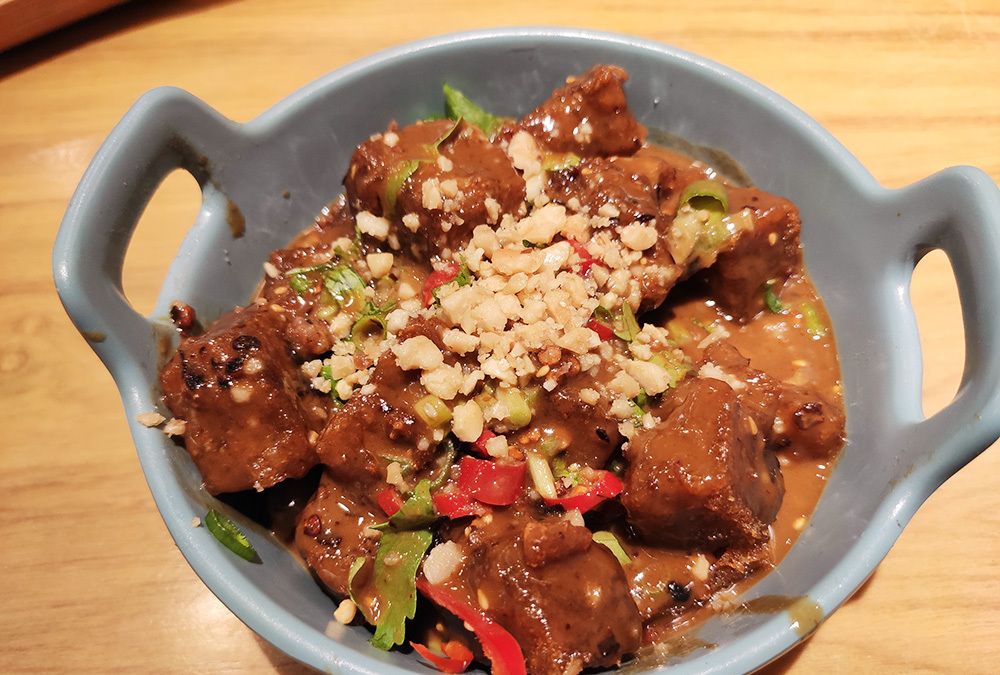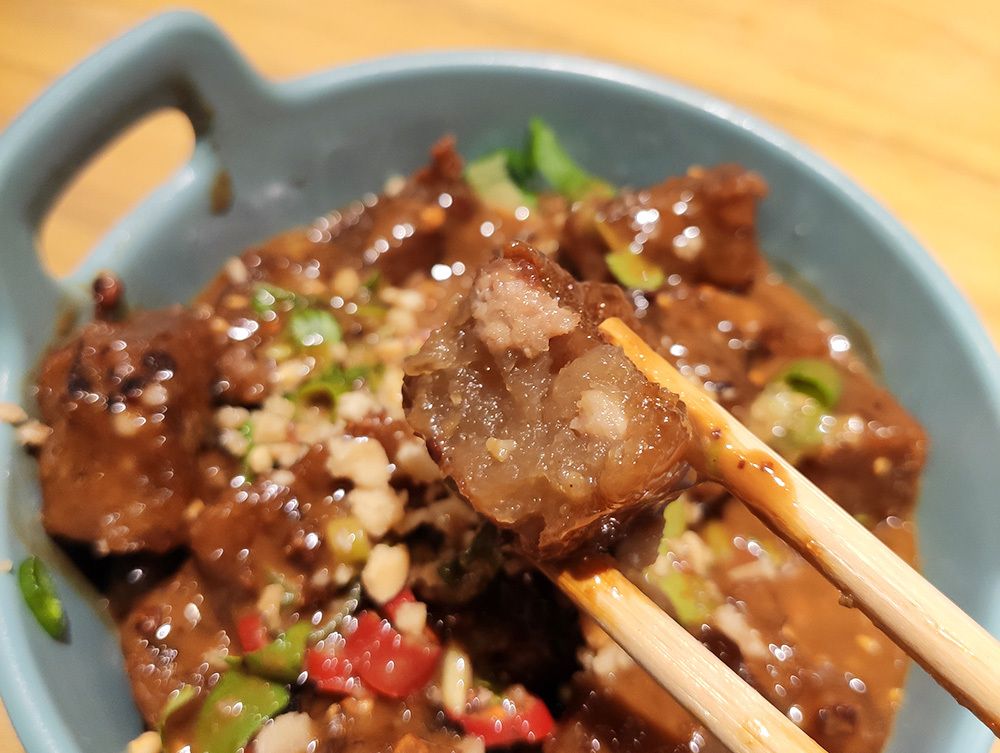 黑乎乎的麻酱焖子,本来以为会很咸,没想到酸甜适中,麻酱香气浓浓包裹住弹糯的焖子,咬开才知道,原来焖子本身就是偏暗色的,好吃!