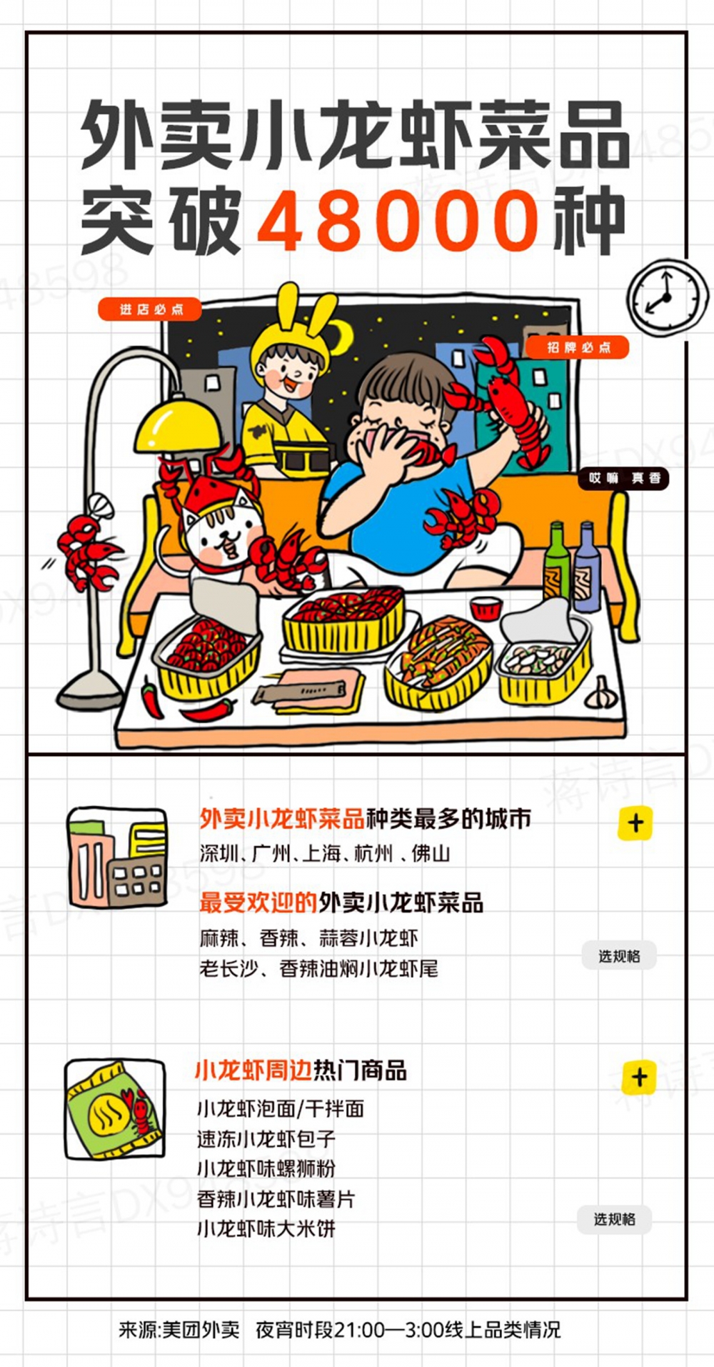 夜幕降临,城市烟火气升腾,美食是“夜经济”中当之无愧的主角。对于喜“宅”一族来说,外卖成为了每日生活的必需。近日,记者从美团外卖方面了解到,今年夏天以来,小龙虾、串串、茶饮、麻辣烫、烧烤成为外卖夜宵最热销的餐品,其中小龙虾外卖菜品突破48000种。有市民感慨,现在线上点外卖的菜品丰富度甚至比直接去店里吃还要高。