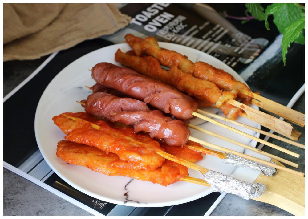 食材:鸡胸肉串,热狗肠,骨肉相连。