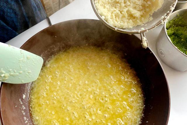 5、翻炒过程中注意观察蒜米,到炸成金黄色的时候,就可以进行下一步了。