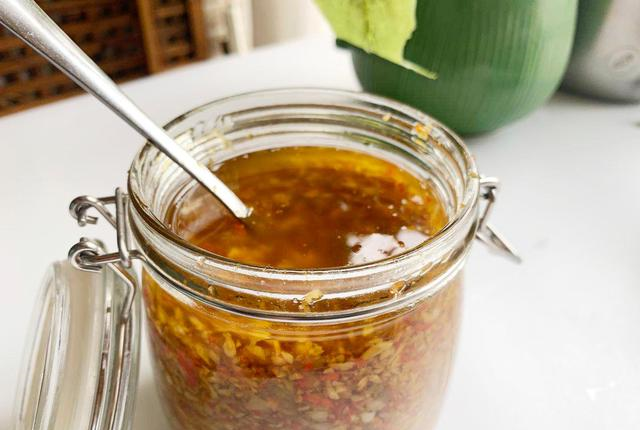8、关火晾凉后装入无油无水消毒的罐子里,直接进行调味,加入美极鲜和蚝油即可。
