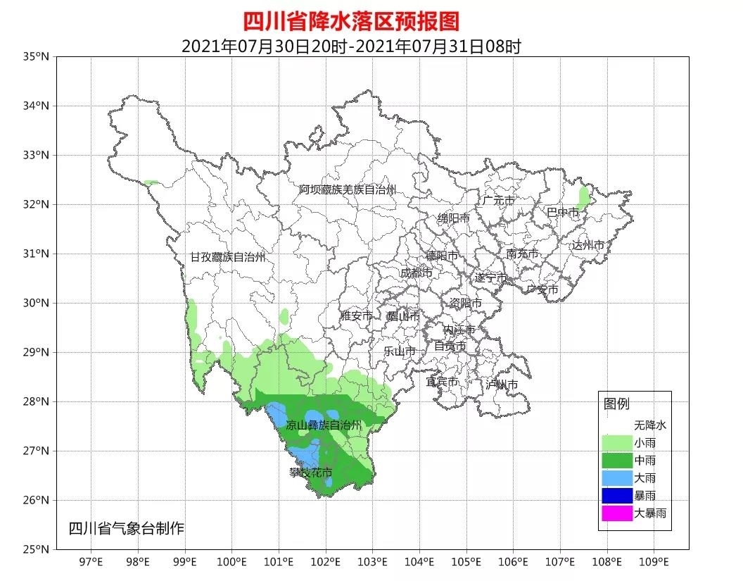今天(7月30日)晚上:盆地各市晴间多云;川西高原大部多云间晴,其中甘孜州西南部多云间阴有阵雨或雷雨;攀西地区阴天间多云有小到中雨,其中西部、南部有大雨,个别暴雨。