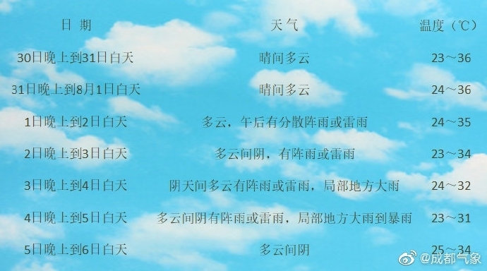 明天(7月31日)白天:盆地各市晴间多云;川西高原大部多云间晴,其中甘孜州西部、南部多云间阴有阵雨或雷雨,攀西地区阴天间多云有阵雨或雷雨,南部有中雨,局部大雨。