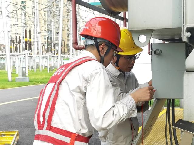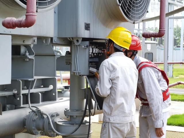 和两个同事正在对变电设备进行维护和检修