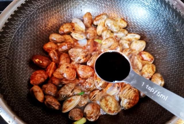 5、接着是加入一小勺子的蚝油,蚝油可以起到提鲜的作用,这样炒出来的菜味道更加鲜美。但是蚝油不用多加,因为花甲本来就是很鲜的食材。
