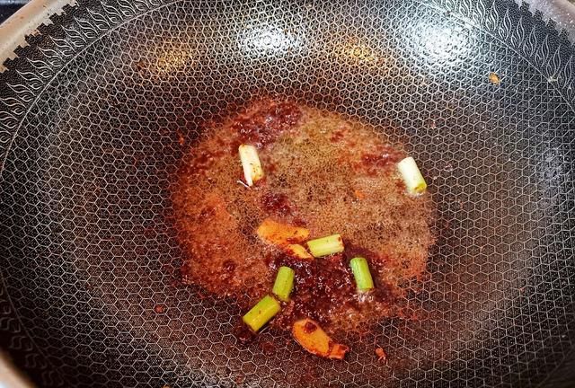 2、这时锅中加入少许的食用油,等到油温热了之后,放入葱白和豆瓣酱,要姜豆瓣酱的红油炒出来,这样味道会更好。