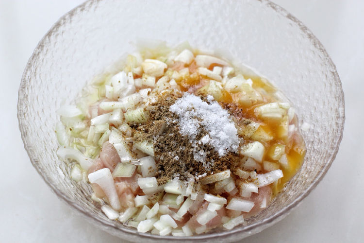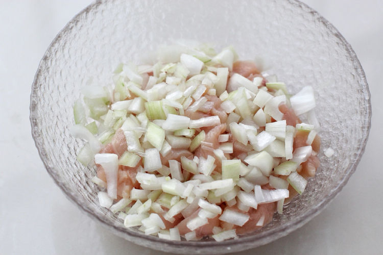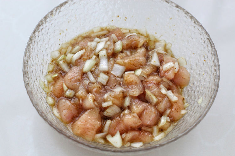 2.将切好的鸡肉块放入容器中,再把洋葱切成小丁和鸡肉混合。