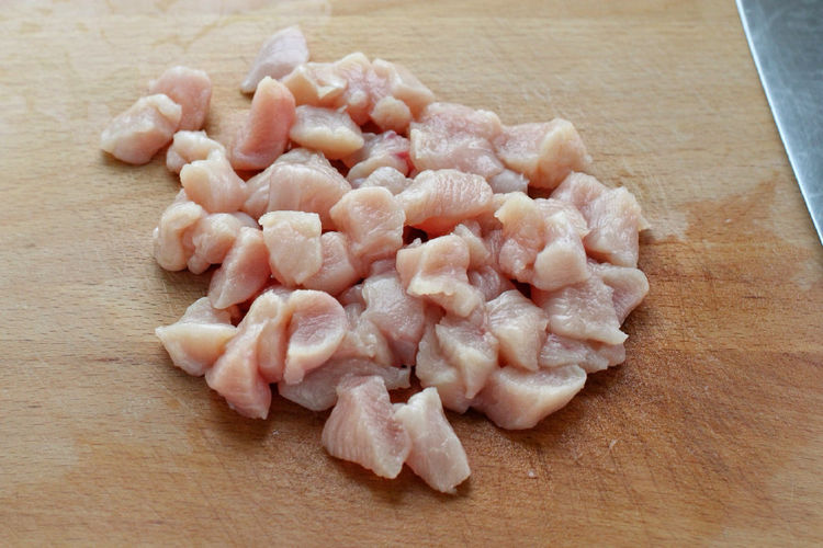 1.鸡胸肉洗净后剔去表面筋膜,先切成粗条,再改切成1.5厘米见方的块状。