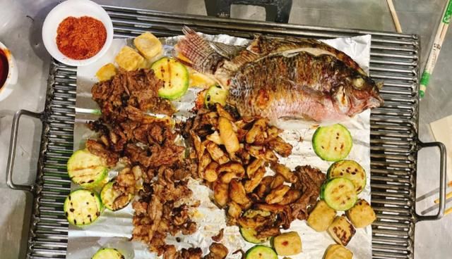 环境就不用多说了,就是大排档的感觉,服务人员也不多,坐下随意点点,要上一壶百香果汁,小喝一杯,紧接着就是烧烤了,烧烤也算有特色,围着坐一个烤炉,中间锡纸垫上,点好的菜品都是店家烤好以后再上桌,小火继续烤制,蔬菜和肉最后都会放在一起,分量很大,不一下子便堆满了。