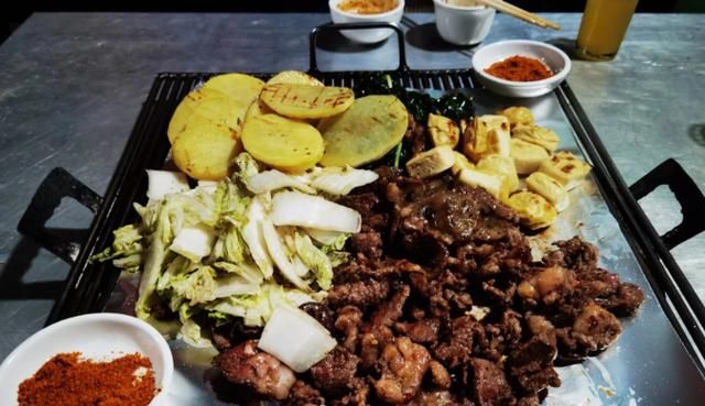 烤豆腐用的是当地人自己做的豆腐,类似于建水豆腐,不断翻面烤制而成,蘸上辣椒面,入口即化,好吃到停不下来。牛肉膘很肥,蘸上干碟,巴适得很。牛肉烤得比较嫩,跟胸一起搭配生菜吃,又香又解腻。尤其是他家的蘸水,有的店是一大堆料让自己调,而他家都是事先调配好的,这一点对于我一个外人来说非常的满意!