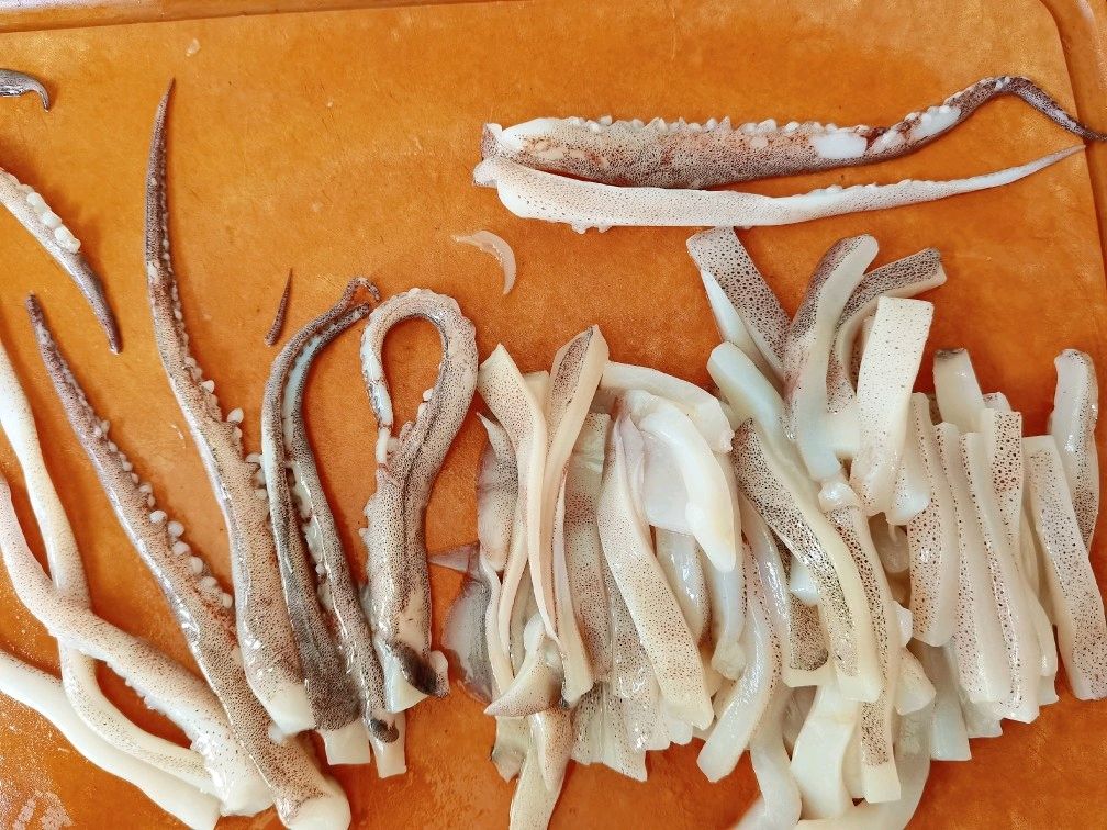 步骤二、将准备好的鱿鱼撕掉表面的黑膜,除去内脏,软骨,用水洗净,全部切成差不多的小段。
