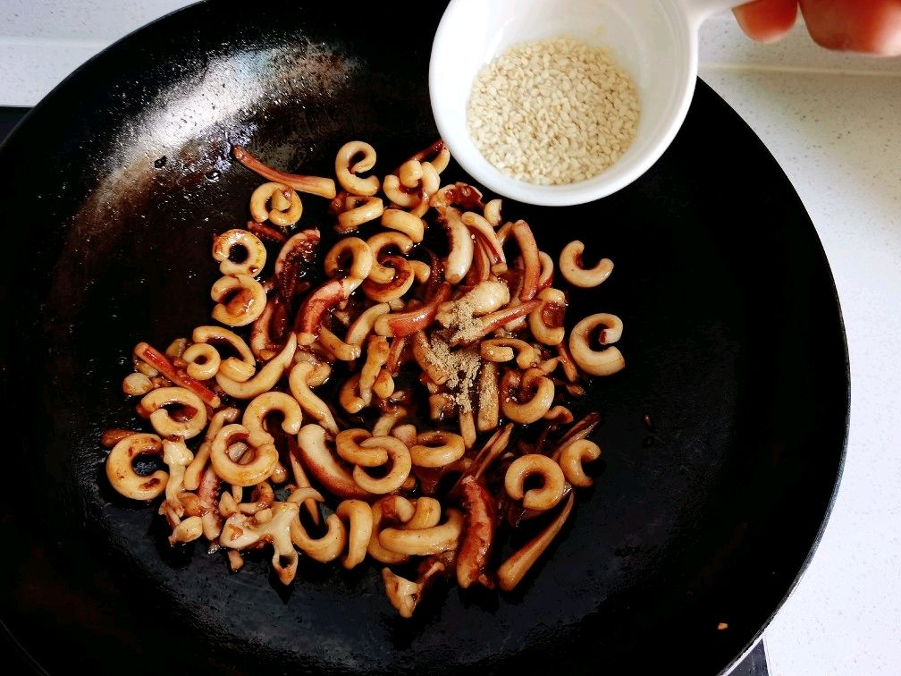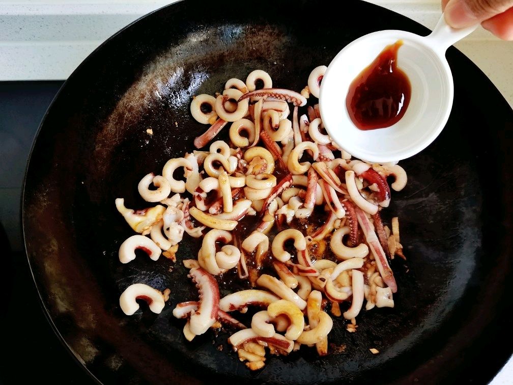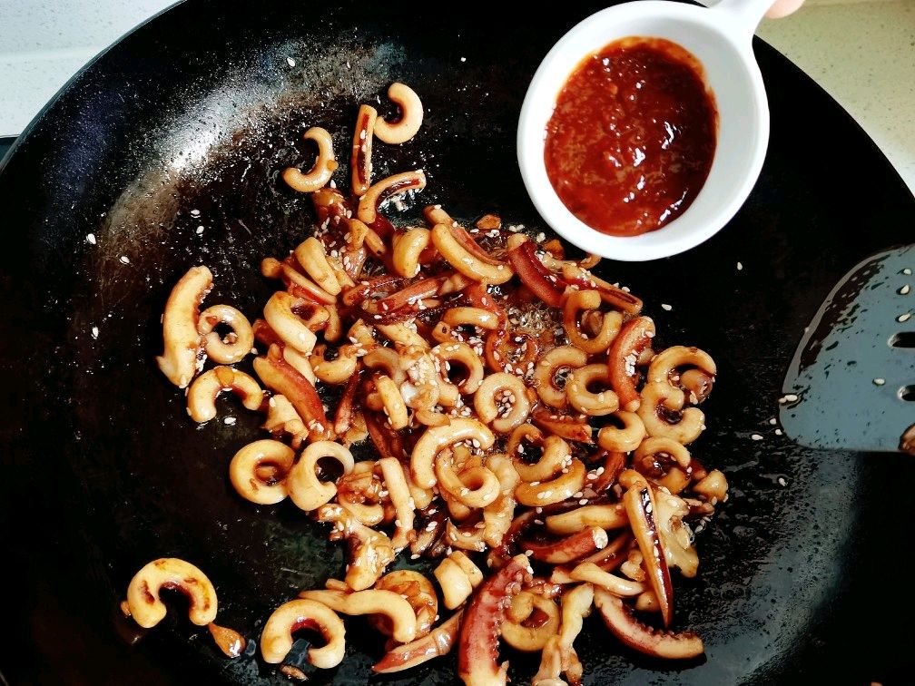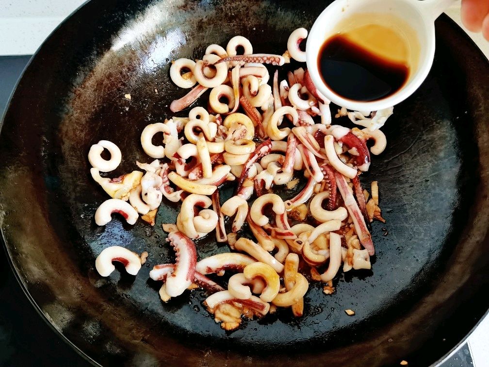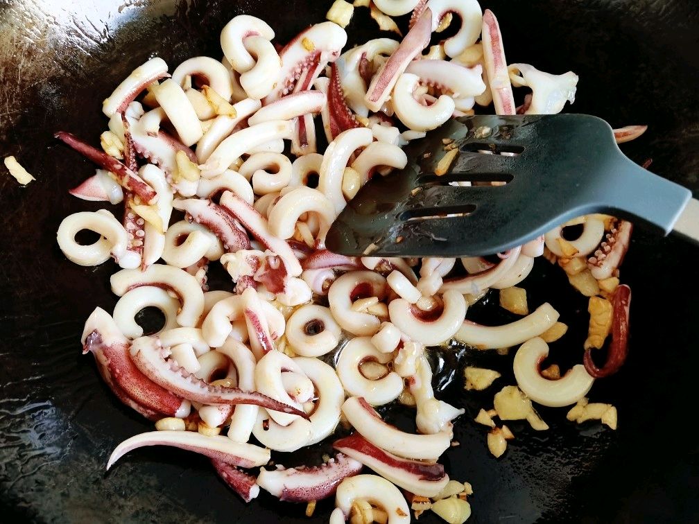 步骤六、将焯好的鱿鱼倒进锅里翻炒。