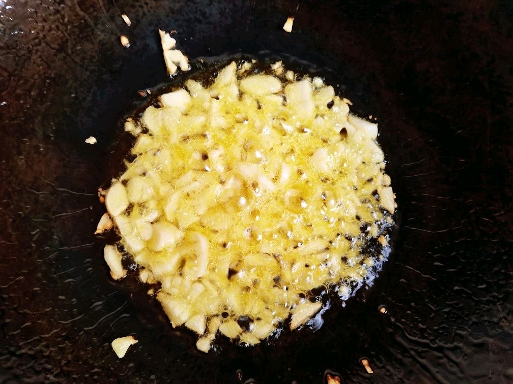 步骤五、热锅倒入适量食用油,加入蒜末炒香。