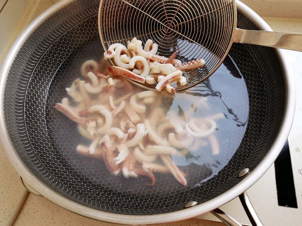 步骤三、开火,锅中加水烧开,倒入适量料酒,把处理好的鱿鱼倒入锅中焯水,大致30秒左右就可以捞出。